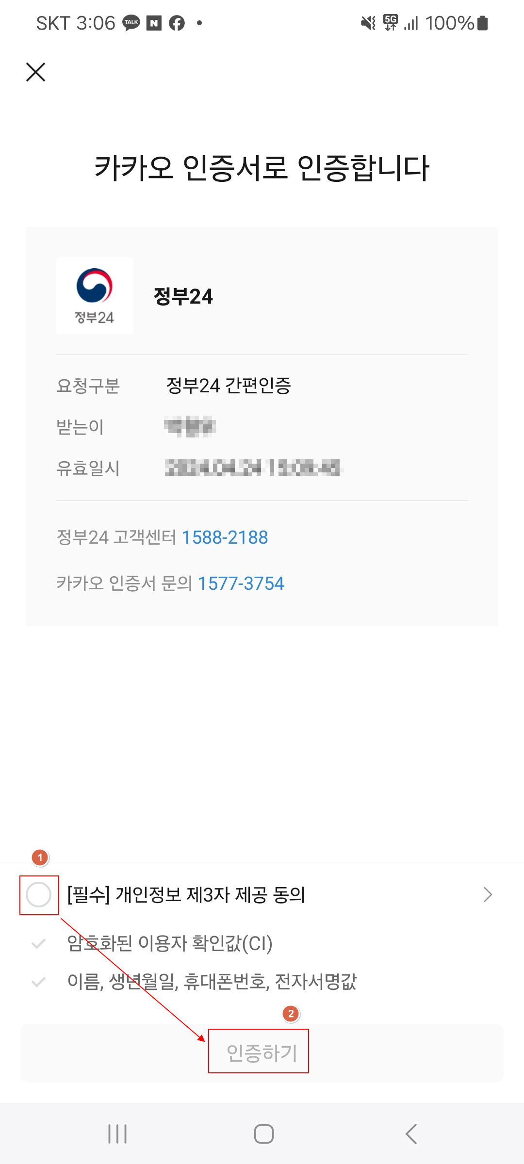스마트폰 카카오톡지갑에서 인증 누르고 | 개인정보 제공 동의하고 | 완료확인 누름 |