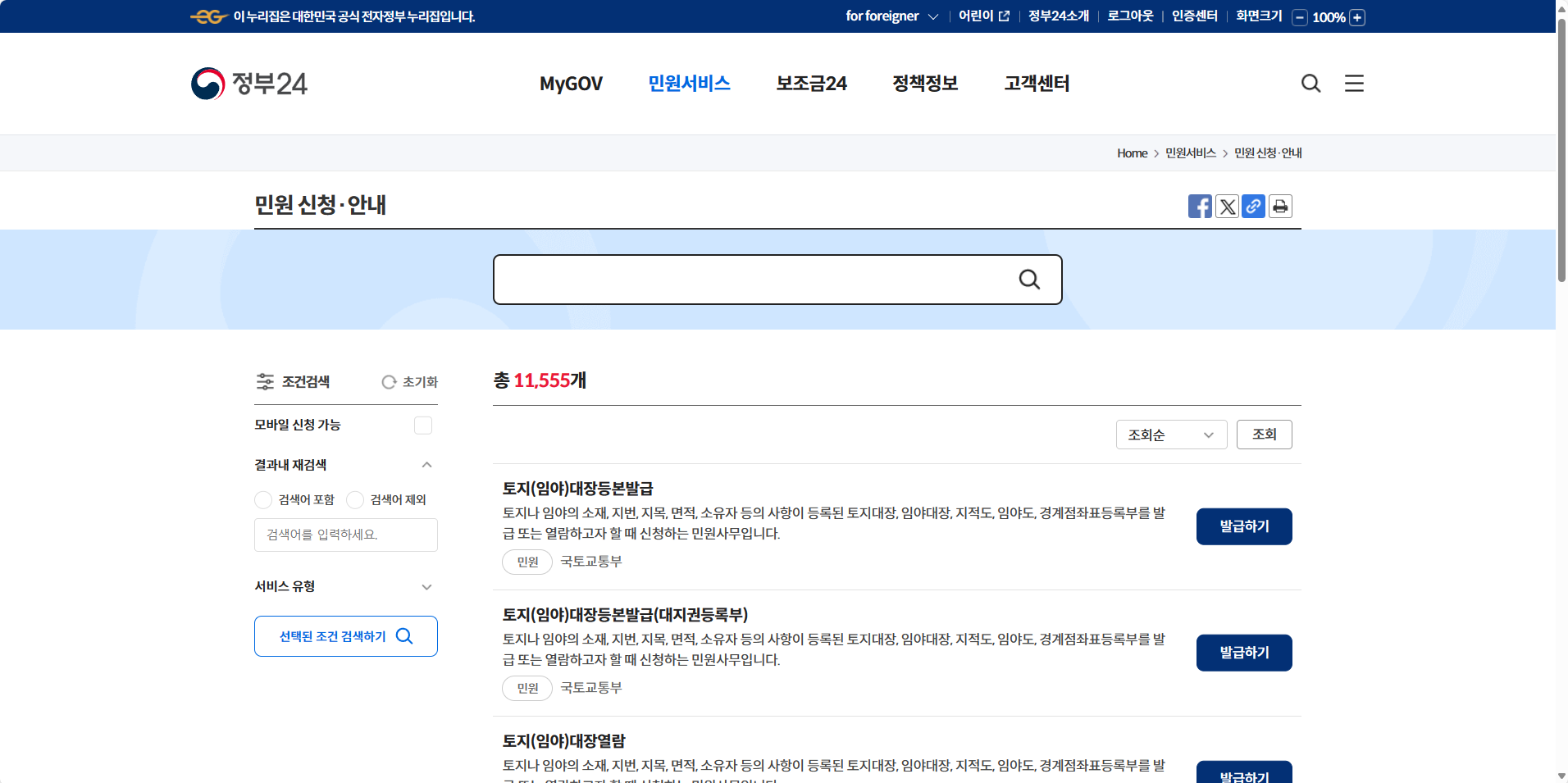 일단 보편적으로 여기서는 민원서비스 화면으로 넘어가는 것을 기준으로 설명하겠습니다.